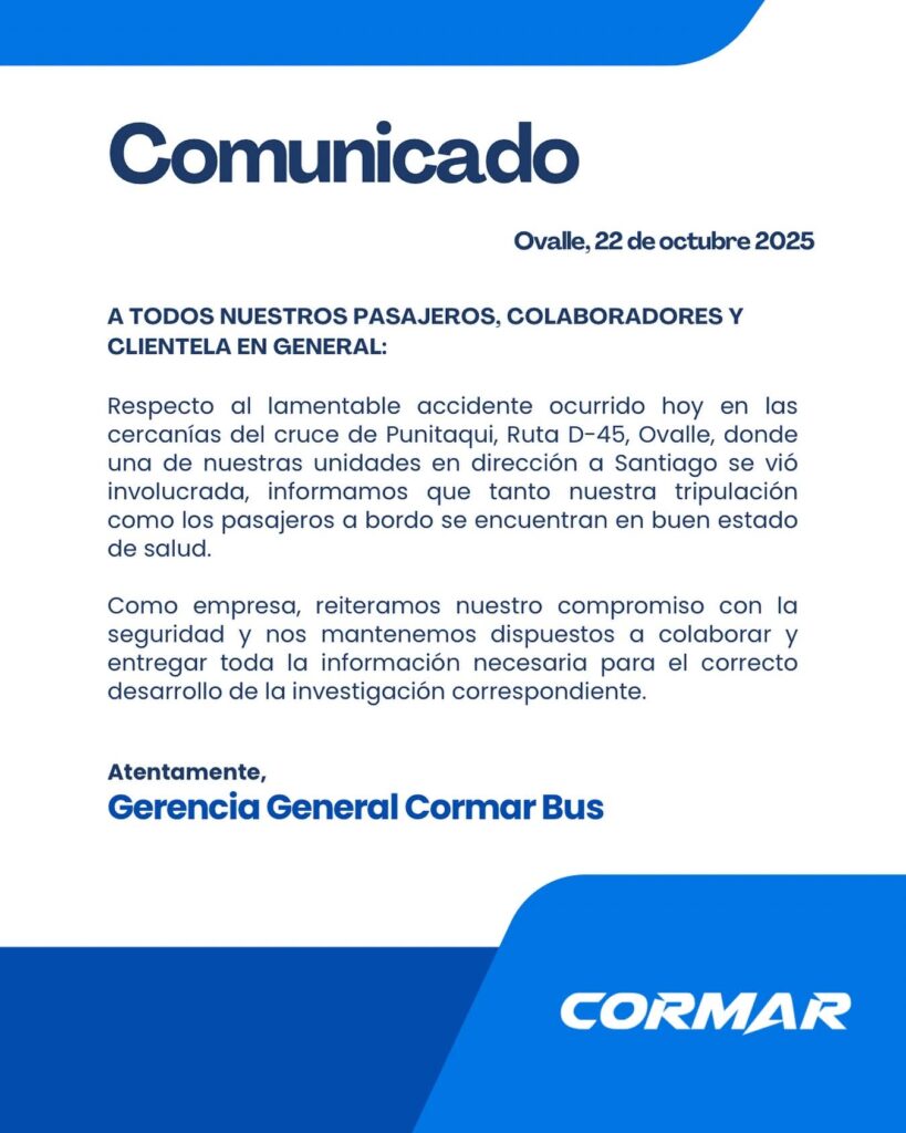 En tanto, los 17 pasajeros del bus no presentaron lesiones, mientras que el conductor y dos auxiliares resultaron con heridas leves, siendo derivados al Hospital de Ovalle para su evaluación.