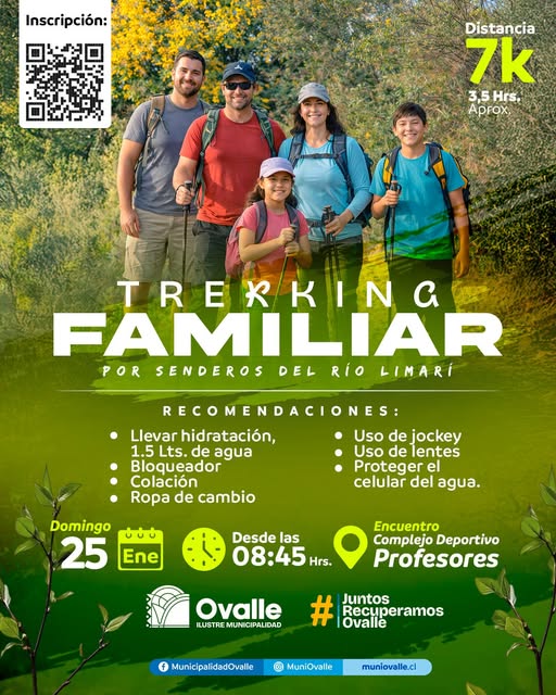 Una actividad de trekking familiar se desarrollará este domingo 25 de enero en Ovalle, con un recorrido por los senderos del río Limarí, iniciativa que busca fomentar la actividad física y el contacto con la naturaleza entre vecinos y vecinas de la comuna.