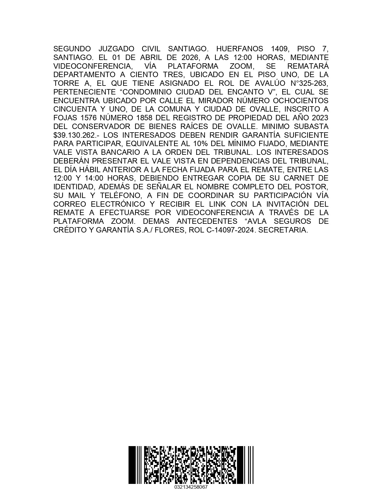 Remate. Departamento 103, Condominio Ciudad del Encanto V, ubicado en calle El Mirador 851, Ovalle